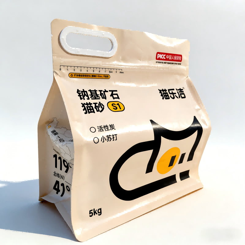 โครงสร้างถุง: โครงสร้างซีลแปดด้านให้รูปทรงตั้งตรงและมั่นคง เหมาะสำหรับตั้งโชว์บนชั้นวาง ซิปที่ปิดผนึกได้และด้ามจับพลาสติกเสริมช่วยให้หยิบจับได้ง่ายและจัดเก็บทรายแมวขนาด 5 กก. ได้อย่างปลอดภัย
